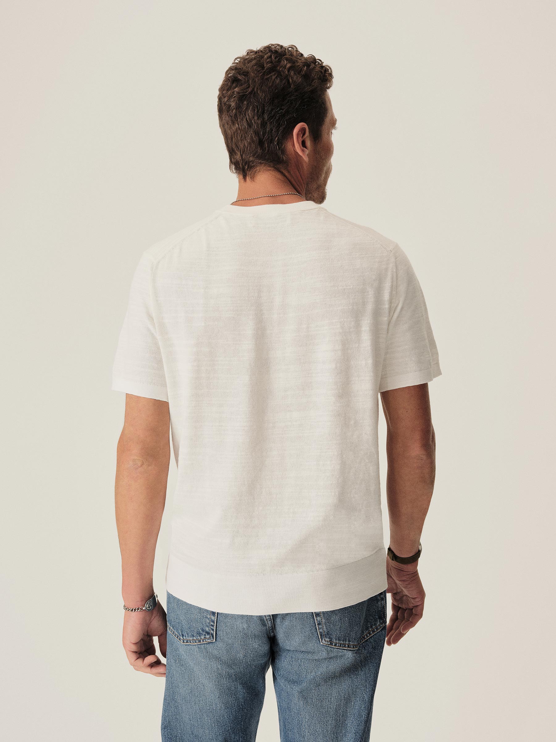 Classic fit short sleeve sweater tee with a straight hem. Yarn-dyed 16 gauge cotton jersey features light slub texture. Features double layer 1×1 ribbing at the collar and rib finishing at the cuffs and hem. Constructed with hand-linked seams for improved durability.