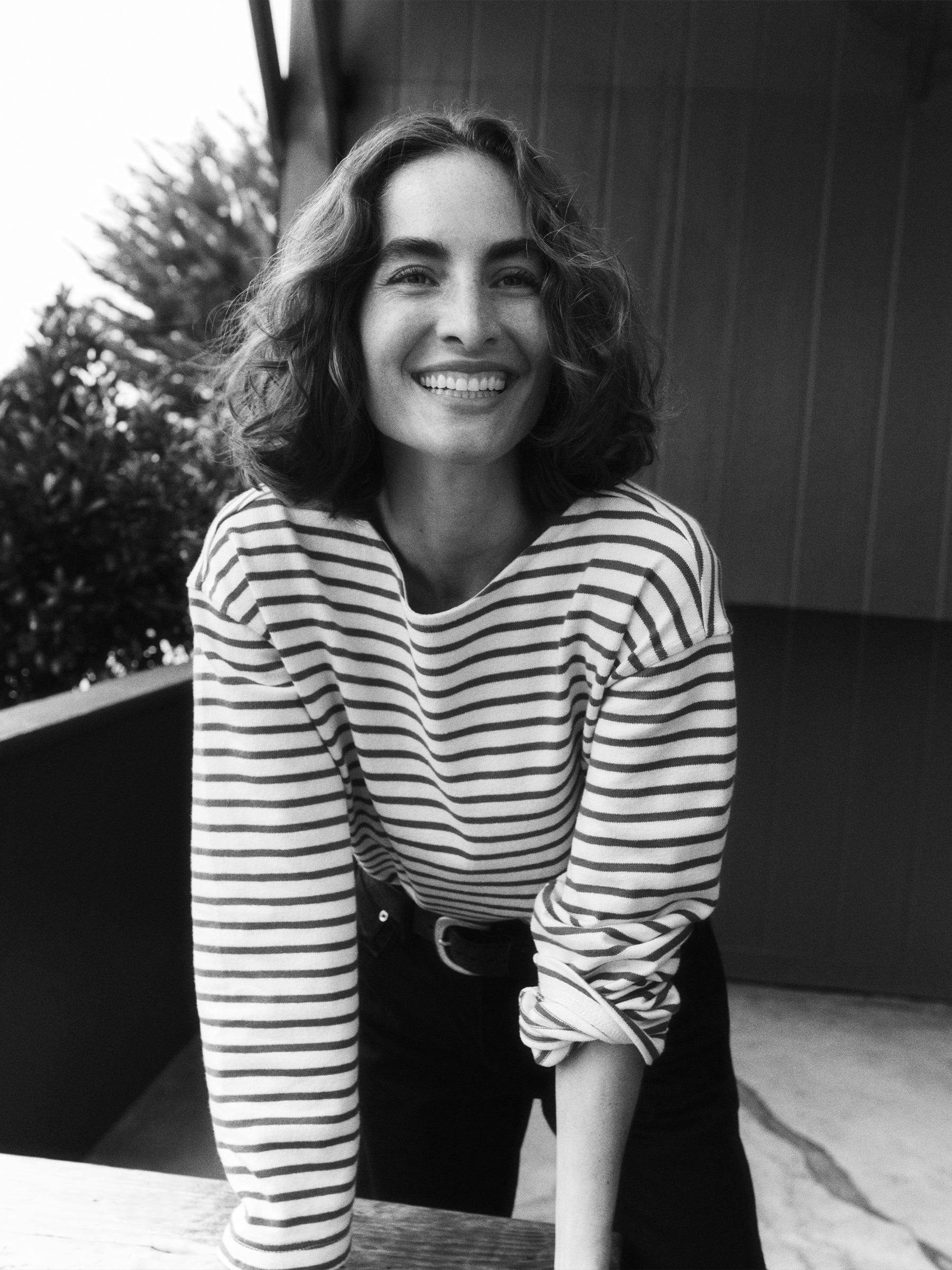 Relaxed long sleeve boatneck tee inspired by the classic French breton shirts. Cut from sturdy, compact 350 GSM cotton. Details include a taped boatneck neckline and side slits at the hem. Constructed with flatlock stitching throughout and double needle coverstitching at the hem. Garment washed for a lived-in feel.
