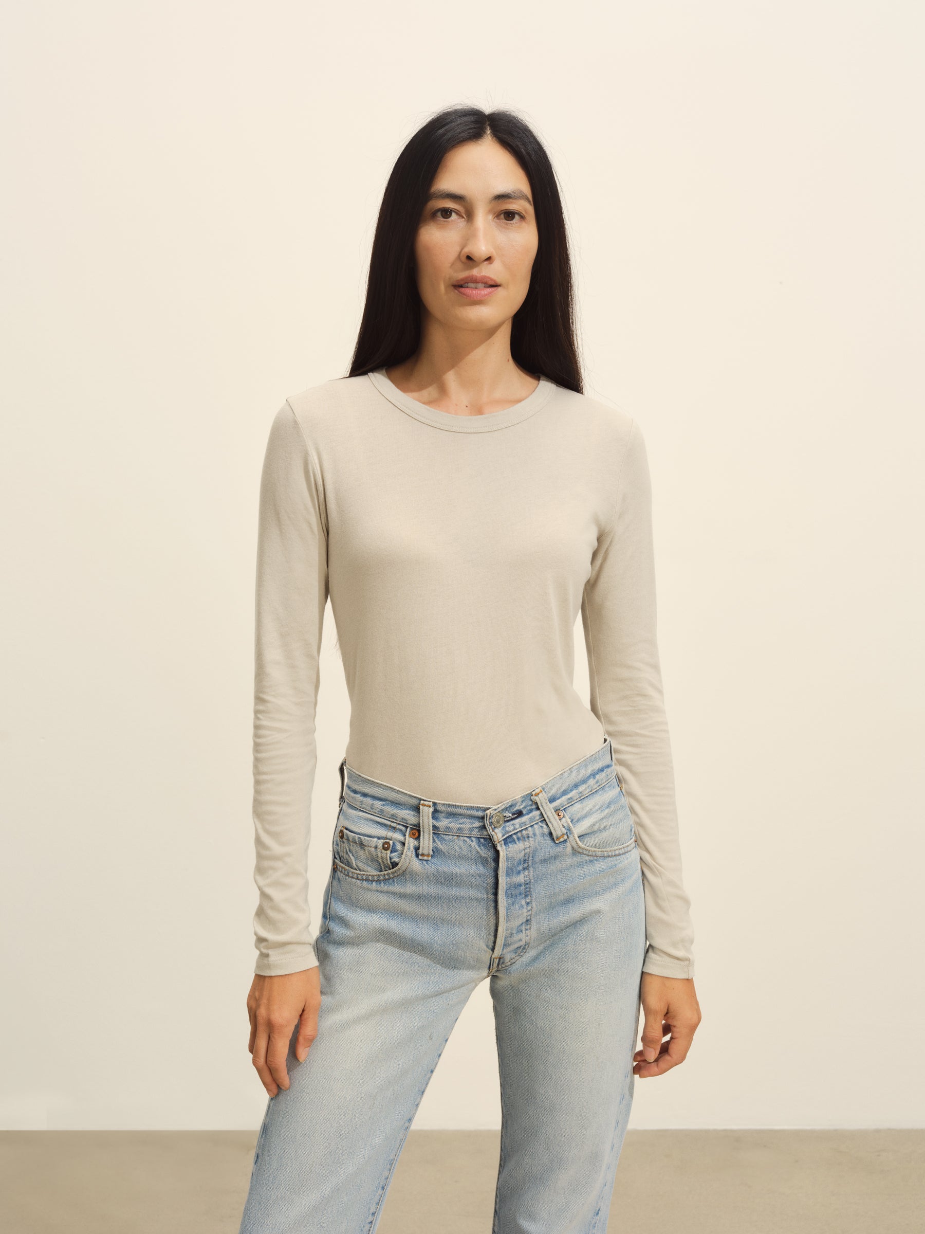 Slim fit long sleeve crewneck tee cut from a supersoft 130 GSM blend of bamboo, cotton, and wool. Features a straight hem, a self bound neck, and raised armholes that hug the contours of the shoulders. Garment washed for a lived-in feel.