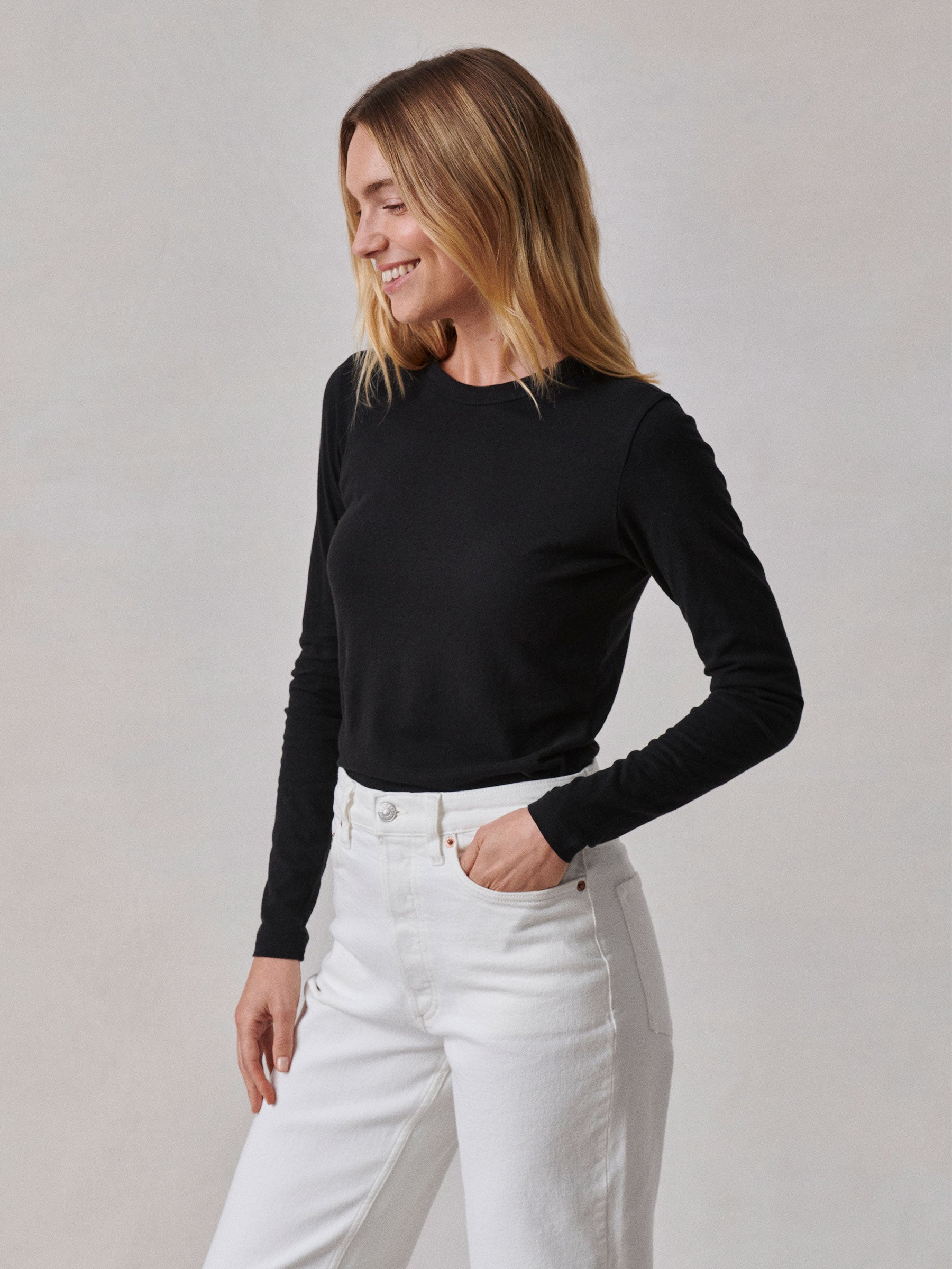 Slim fit long sleeve crewneck tee cut from a supersoft 130 GSM blend of bamboo, cotton, and wool. Features a straight hem, a self bound neck, and raised armholes that hug the contours of the shoulders. Garment washed for a lived-in feel.