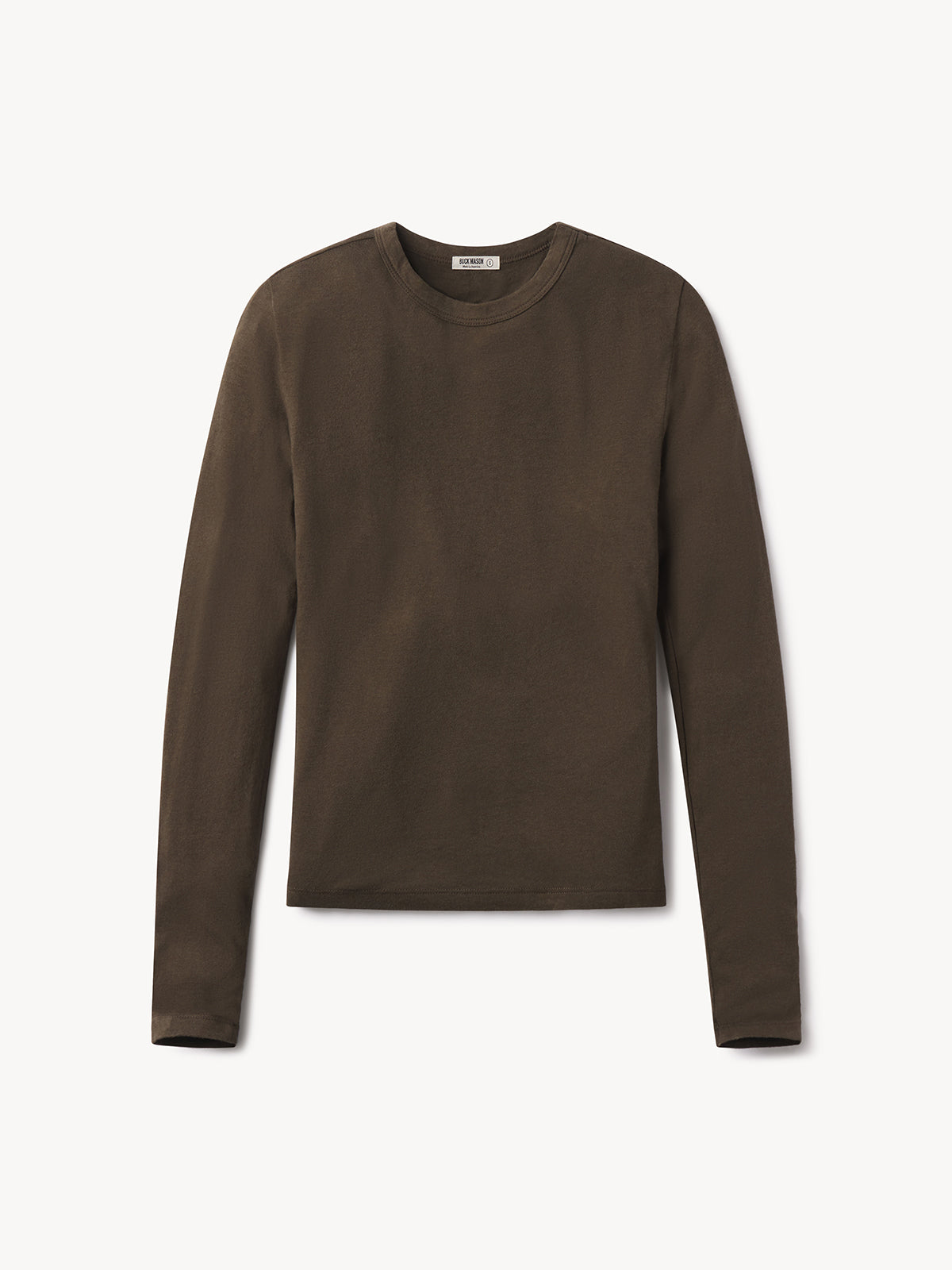 Slim fit long sleeve crewneck tee cut from a supersoft 130 GSM blend of bamboo, cotton, and wool. Features a straight hem, a self bound neck, and raised armholes that hug the contours of the shoulders. Garment washed for a lived-in feel.