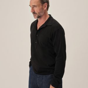 A popover shirt made from a midweight compact cotton jersey with a smooth, uniform texture and cool hand. It features a traditional shirt collar with a four-button half placket and single chest pocket. Ribbed sleeve cuffs.