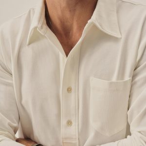 A popover shirt made from a midweight compact cotton jersey with a smooth, uniform texture and cool hand. It features a traditional shirt collar with a four-button half placket and single chest pocket. Ribbed sleeve cuffs.