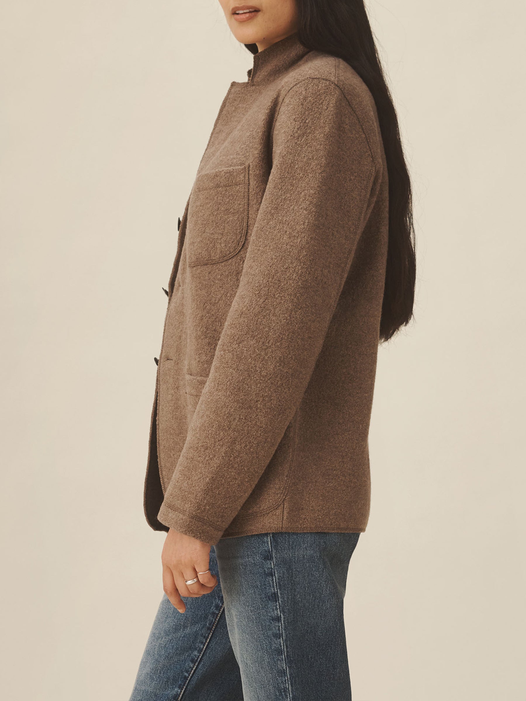 Classic fit chore coat with a slimmer cut through the arms and room in the torso for layering. This 340 GSM felted merino wool has been twice boiled for improved insulation and durability. Details include three patch pockets, horn buttons, and a notch collar. Constructed with hand-sewn facings and coverstitching throughout.