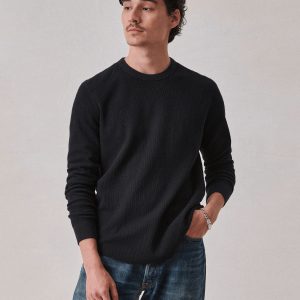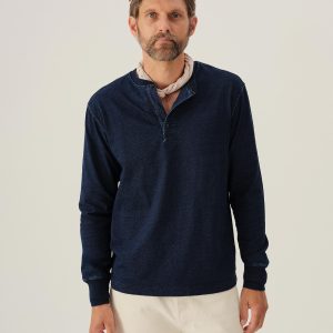 Nautical-inspired boxy fit short sleeve wide neck tee with a straight hem, longer sleeve length, drop shoulder, high neck, and wide ribbed collar. The soft cotton jersey, yarn-dyed in indigo and black sulfur stripe pattern, is about twice as heavy as our Pima tees, with tiny vertical ribs that gently glide across the skin. This is a solid, substantial stand-alone tee for cold weather that will pick up a ton of character over time.
