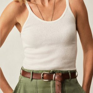 Slim-fit, vintage-inspired scoop tank made from a blend of 60% recycled cotton and 40% cotton. Featuring a combo of jersey fabric and scallop stitch details at the armholes and neckline, it also includes baby snaps for the bra holder.
