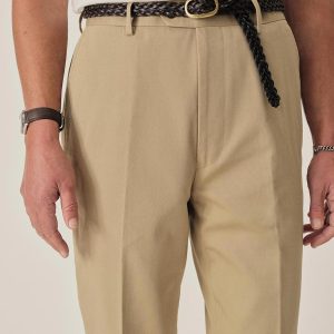 Tailored tab-waist trouser inspired by traditional Ivy style tailoring. Cut from an Italian cotton twill ideal for spring and summer, providing lightweight structure with a uniform appearance. Features a flat front, buttoned tab waist and hook and eye closure. Slash side pockets, on-seam coin pocket, two welt back pockets. Front lined through the knee for comfort. 35″ unfinished hem. Pair with our Graduate Blazer for a full suit.