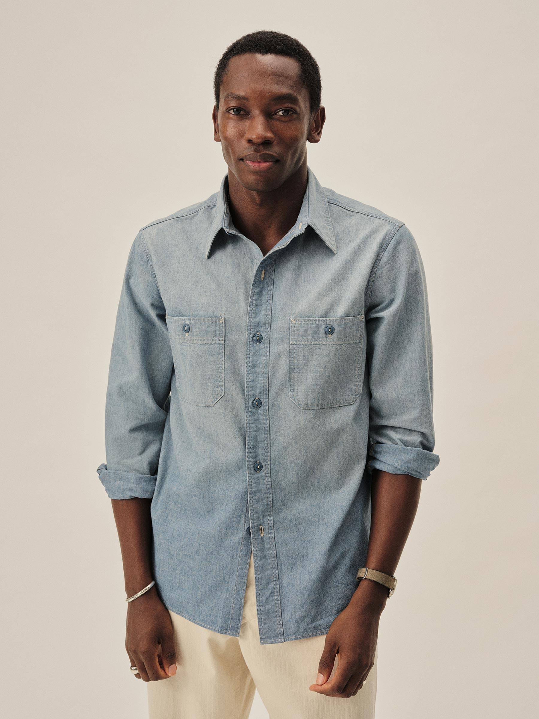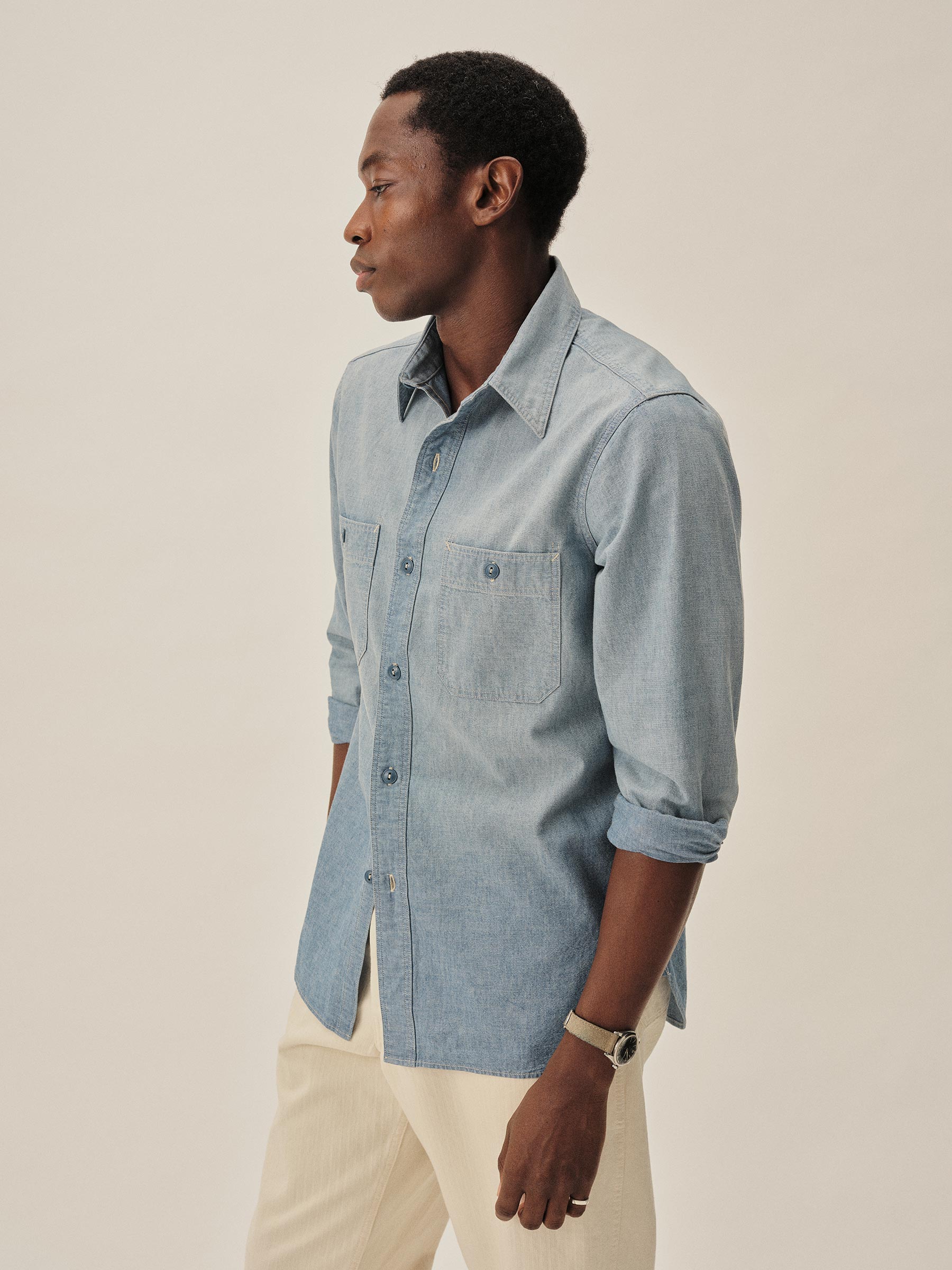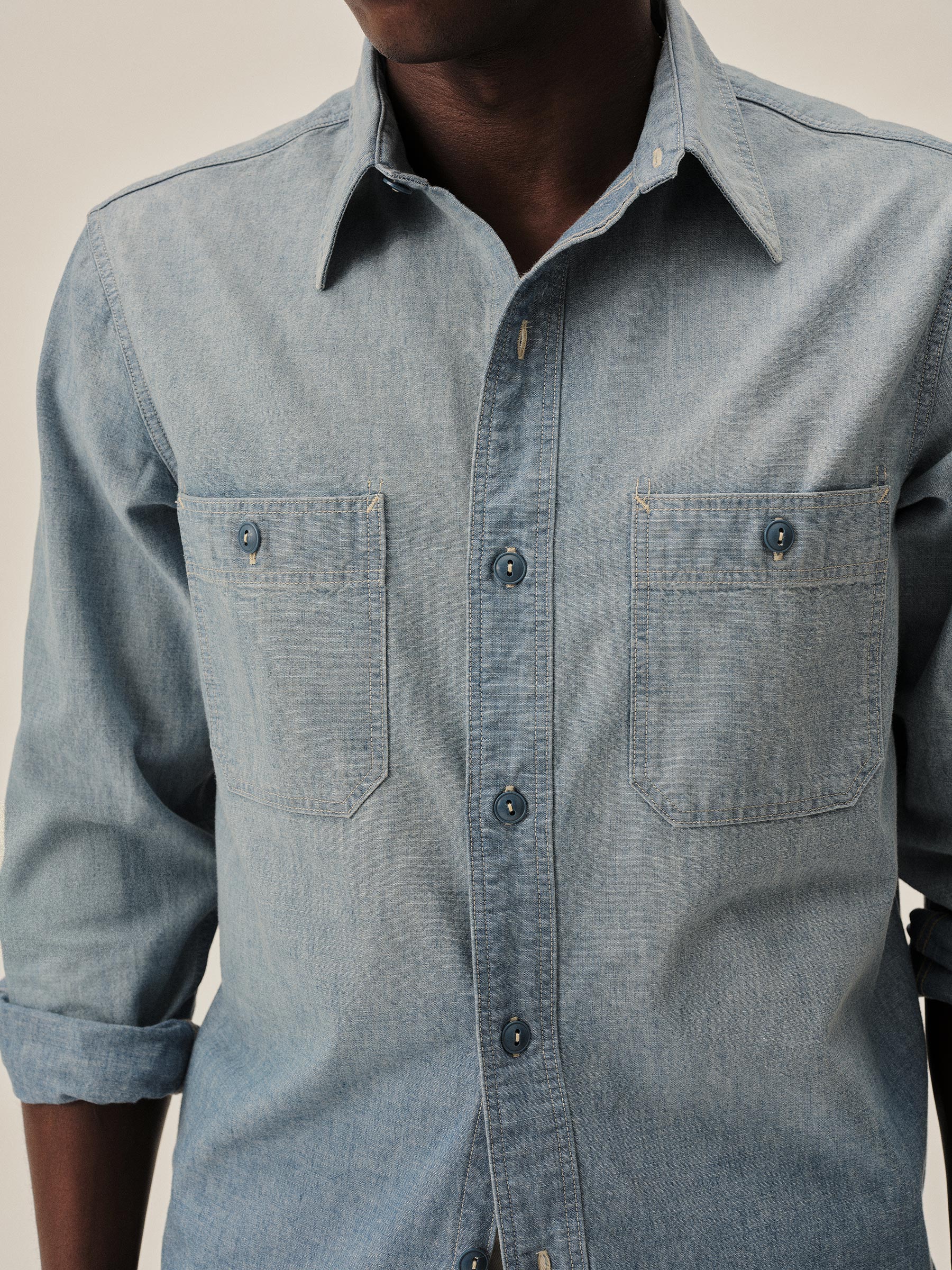 Classic fit work shirt cut from 5 oz indigo yarn-dyed chambray. Details include tonal buttons, two chest pockets, and run off stitching at the side gussets. Constructed with clean finished seams. Garment washed for a lived-in look and feel.