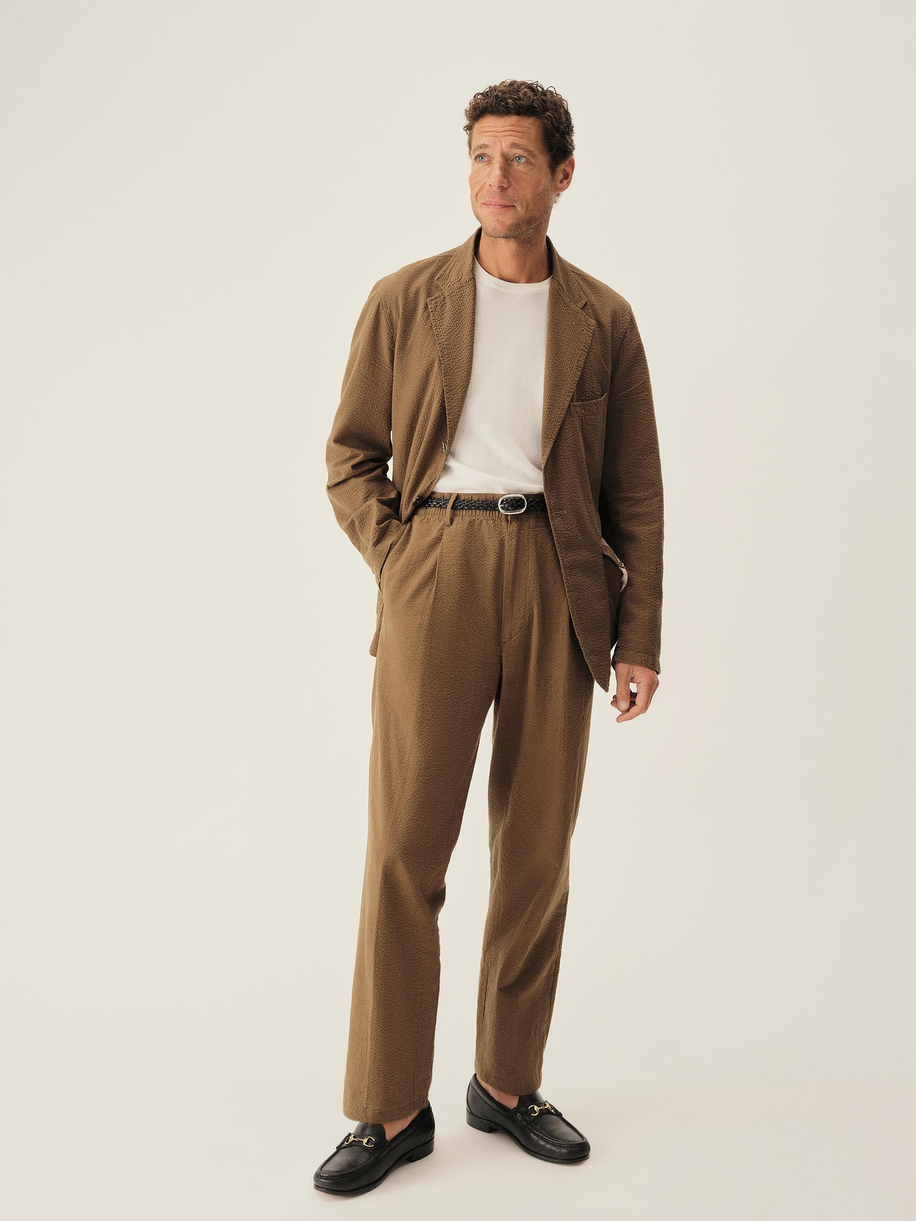 Tailored 3-roll-2 button blazer inspired by timeless vintage suiting. This 5 oz cotton seersucker has a rippled texture that wicks moisture and maintains airflow making it ideal for warmer climates. Details include two patch pockets, two internal welt pockets, and a notched lapel. We left it unlined and omitted the back vent and cuff buttons for a casual, streamlined look. Constructed with hand-linked seams and garment washed with enzymes and softener for a lived-in feel.