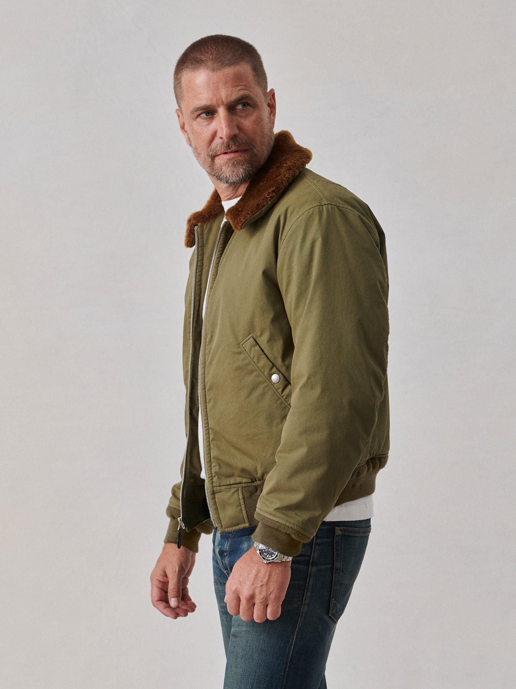 In 1944, the B-15 jacket became standard issue for the USAAF. We’ve brought it into the 21st century with a premium weather cloth we developed with Olmetex in Italy, blending a premium finish with all-weather performance. Filled with PrimaLoft insulation, it’s finished with a shearling collar, corozo-buttoned throat latch, enamel-coated snap front pockets, interior welt pocket, die-cast zip front closure, and rib cuff and hem.