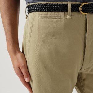The classic officer’s pant in our Full Saddle fit: high-rise, straight through the thighs and leg. Cut from 9.5 oz cotton twill that has been washed to achieve the same look and feel of vintage service uniforms. Features a “Hollywood” one-piece waistband construction, slash front pockets, buttoned flap back pockets, and a welted coin pocket, natural canvas interior detailing, and real corozo buttons. Garment washed with enzymes for a lived-in feel. Button fly.