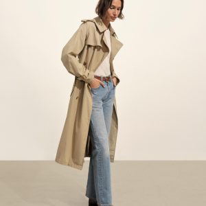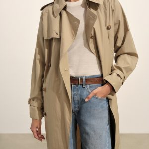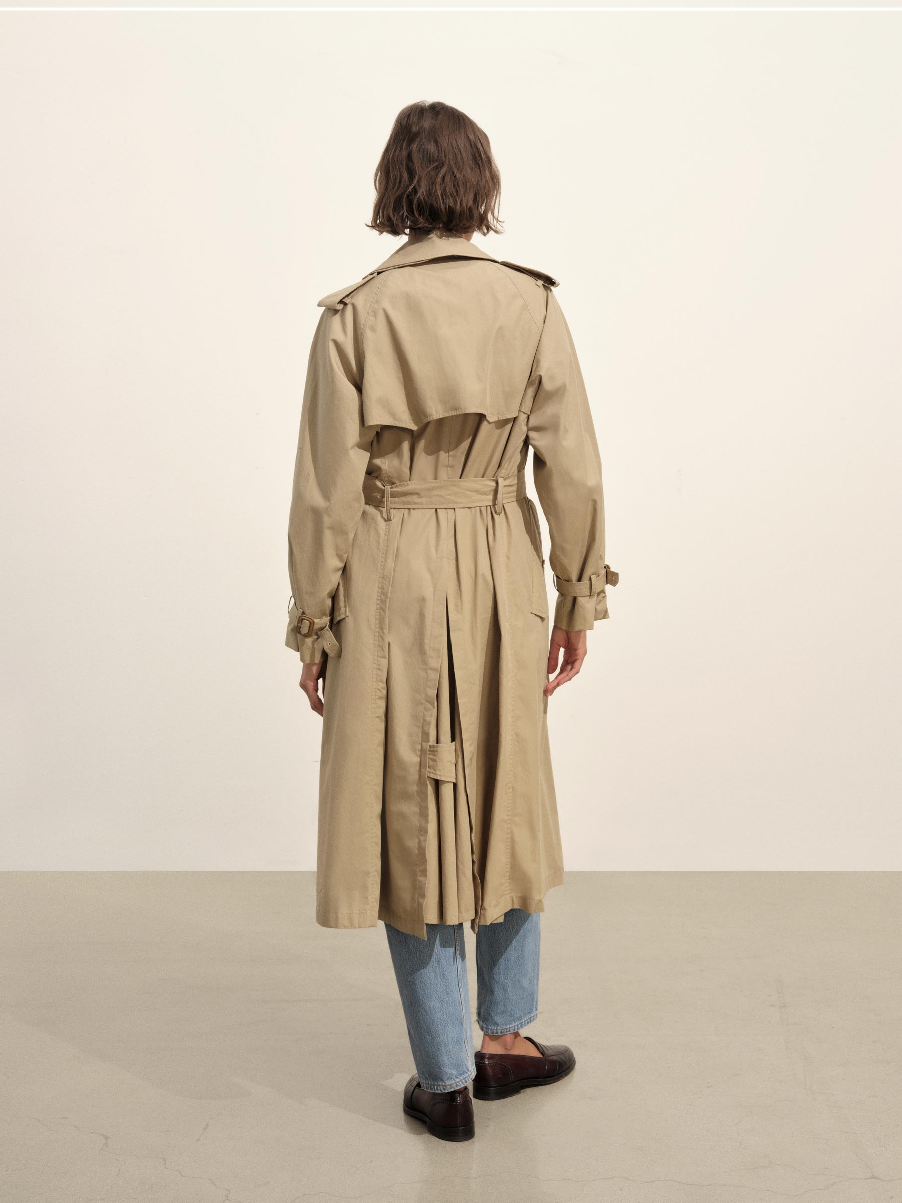 Relaxed trench coat cut from lightly structured 5.5 oz. cotton poplin. Featuring a double-breasted front, gun flap, storm flap, and raglan sleeves with adjustable belts. Detailed with horn/urea buttons, a throat latch with adjustable closure, leather buckles and prongs, and embroidery eyelets. The collar is finished with trapunto stitching, while the interior boasts a half lining for comfort.