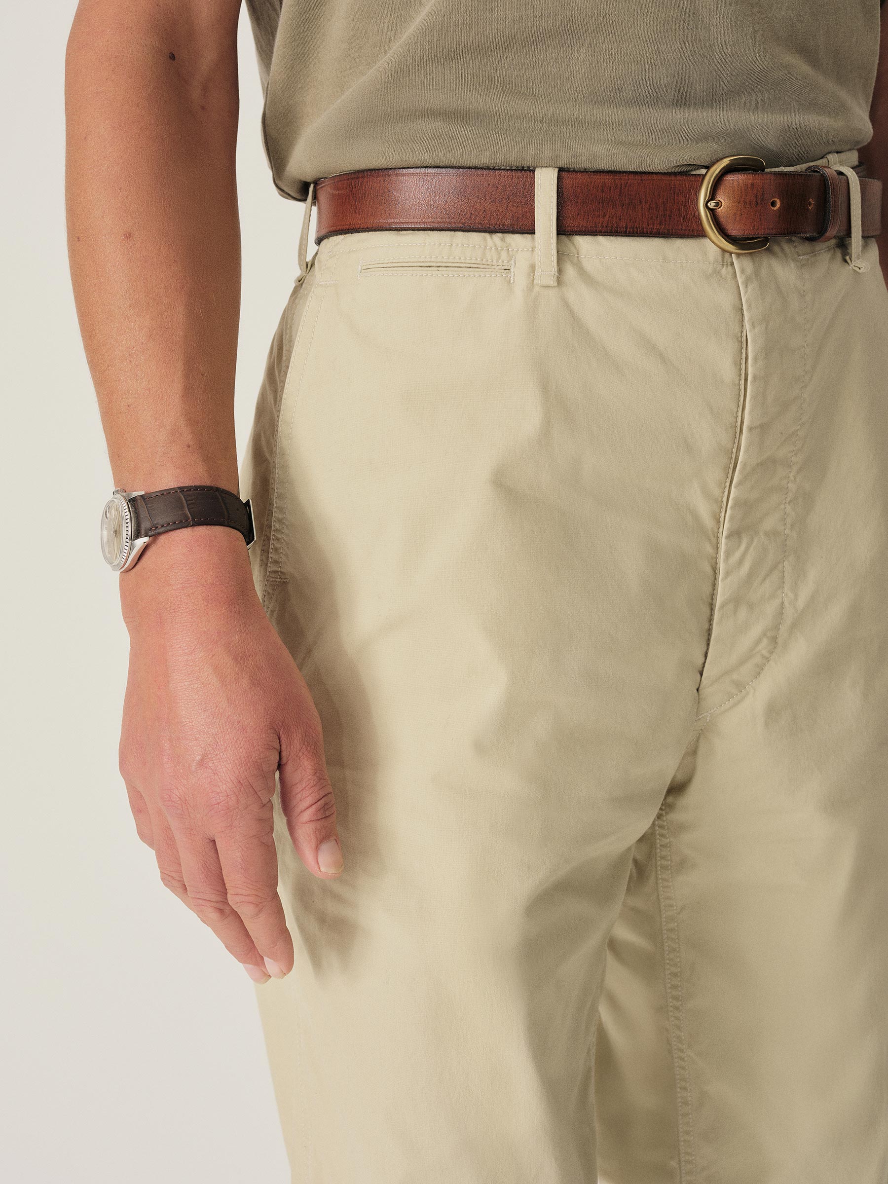 The classic officer’s pant in our Full Saddle fit: high-rise, straight through the thighs and leg. Cut from 5.5 oz. cotton poplin with a crisp hand and light structure that’s suitable for warmer weather. Featuring a one-piece “Hollywood” waistband, slash front pockets, buttoned flap back pockets, and a welted coin pocket. Finished with real corozo buttons.