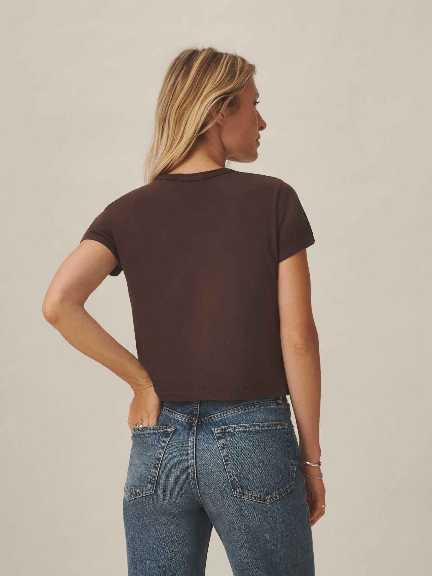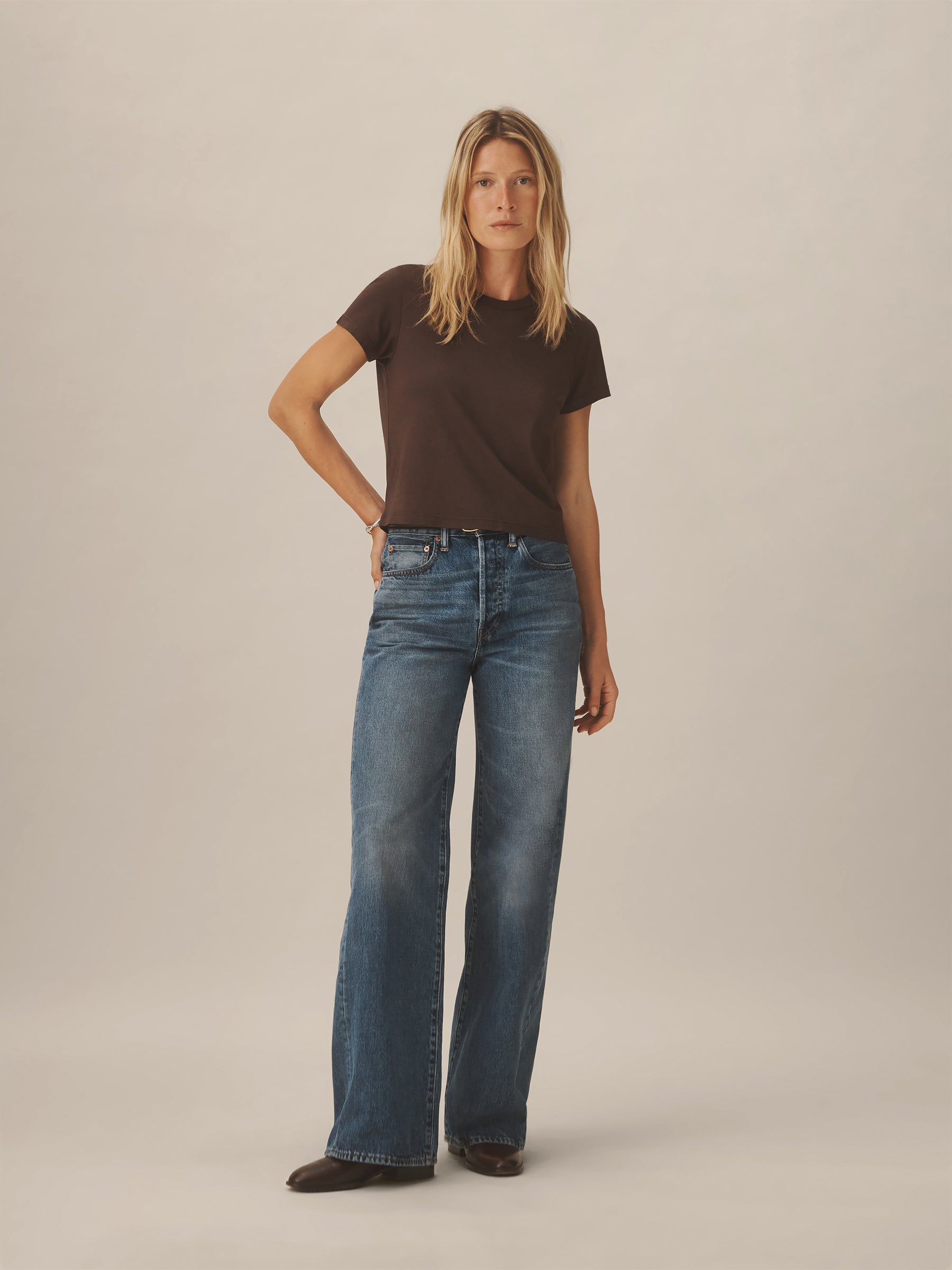 Boxy short sleeve crewneck tee with a straight hem. Cut from 120 GSM Supima cotton. Constructed with rib neck binding and double-needle cover-stitching at the hem. Garment washed for a lived-in feel.