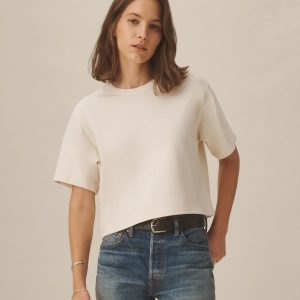 Slim fit short sleeve crewneck tee with a straight hem in 120 GSM jersey, knit from long-staple Supima cotton. Constructed with a durable rib stitch collar and double-needle cover stitch hem. Garment washed with softener for a lived-in feel.