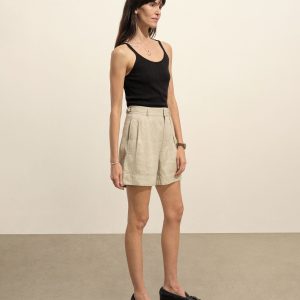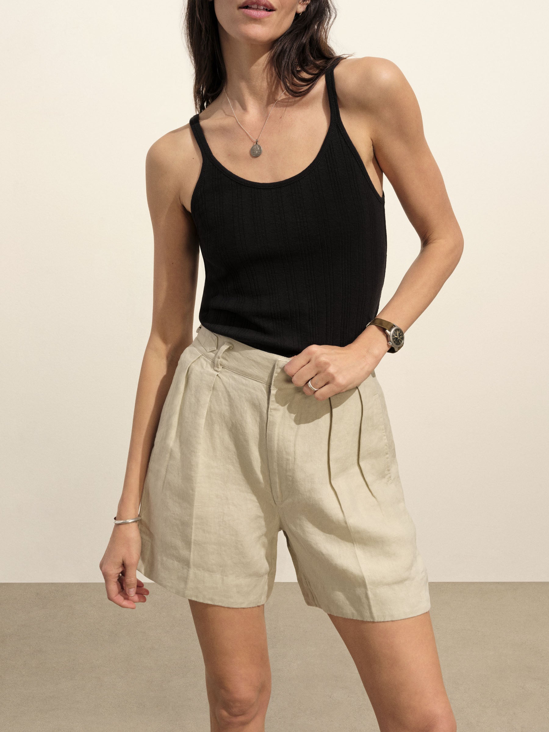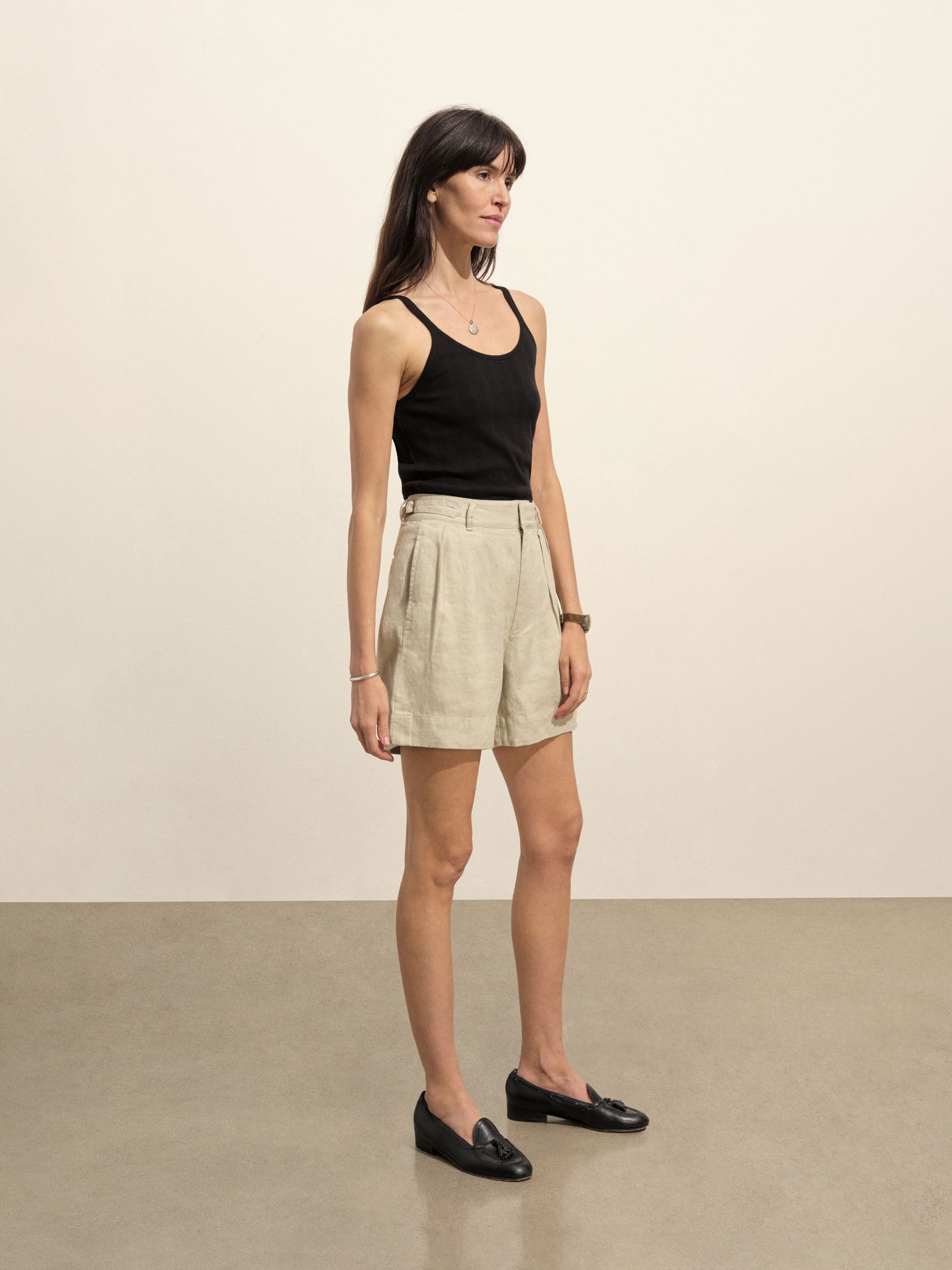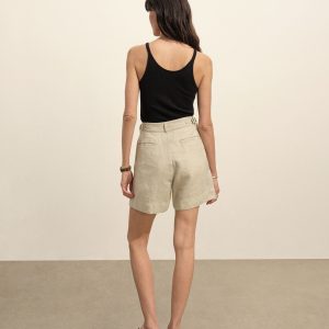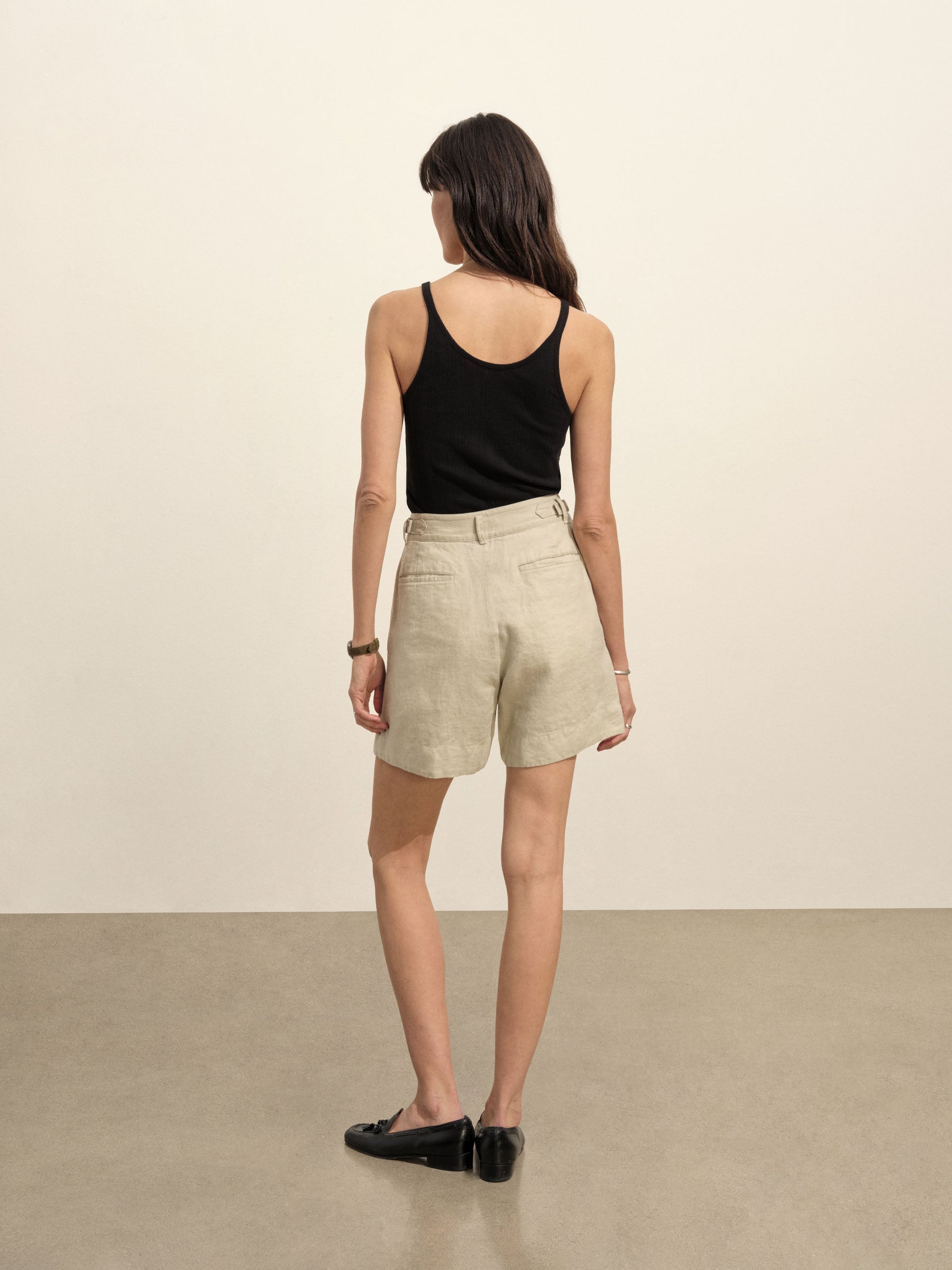 Taking inspiration from 1950s workwear shorts, a high-rise, pleated Bermuda short cut from 6.5 oz. linen with a subtle luster. Framed with a 6” inseam and a high-rise, featuring belt loops, on-seam pockets, back welt pockets, and adjustable tabs with pronged waistband buckles for a customizable fit. Finished with corozo buttons and a hook-and-bar stay button with a zipper-fly closure. Garment washed for a truly vintage look and feel.