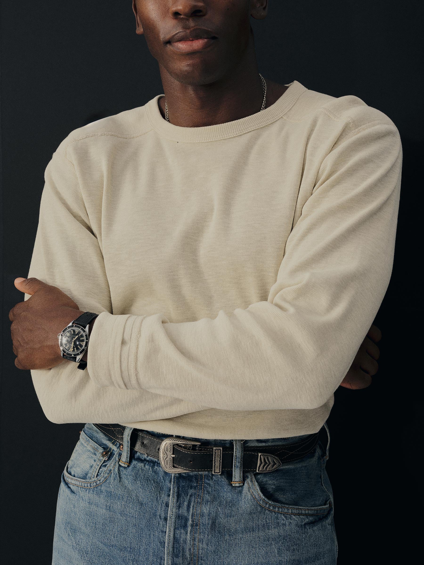 The Sidewinder is inspired by a tee first made a century ago to be worn beneath US military uniforms. When the heat was on, soldiers unbuttoned their top layers, and the tee took on the status we know today: as a garment worn proudly alone. Like the original, ours is made in a substantial ribbed cotton that wears hard but breathes easy