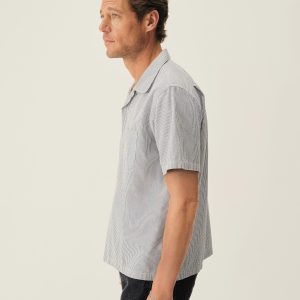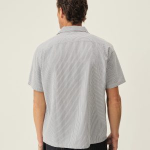 A light, airy seersucker camp shirt cut in a boxy fit with a straight hem. Features a one pocket construction and Mother of Pearl buttons.