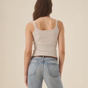 Slim fit ribbed scoop neck tank cut from 295 GSM stretch cotton that holds its shape. 2×2 rib structure—two rows of rib stitch, two rows of jersey stitch—is offset by contrast 1×1 rib at the neck. Constructed with coverstitching throughout and flatlock stitching at the side seams. Garment washed for a lived-in feel.