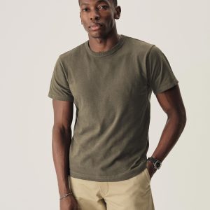 Cut from a midweight 200 GSM USA-grown cotton, developed, milled, and sewn at BM Knitting Mills in Mohnton, PA. This classic fit crewneck tee has a straight hemline, bound neck and screen-printed label for comfort. Constructed with a split-needle cover stitch at shoulders and armholes. Double-washed for a soft, smooth texture and consistent fit.